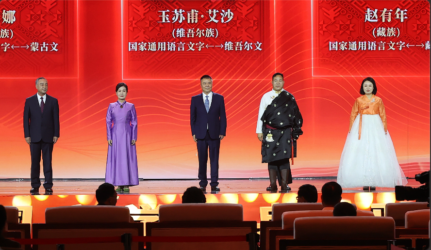 艾布、朵日娜、玉蘇甫·艾沙、趙有年、鄭風淑領(lǐng)取第十三屆全國少數(shù)民族文學創(chuàng)作駿馬獎翻譯獎。