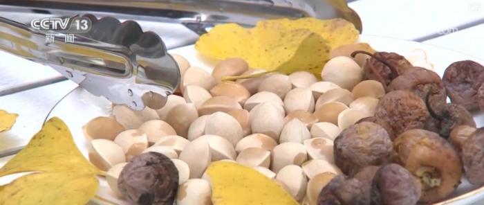 身在銀杏村,這里的鄉(xiāng)親們也是開(kāi)發(fā)研制出了很多既安全又美味,還能發(fā)揮銀杏果“藥食兩用”特性的特色美食。村子里最常見(jiàn)的,是用炭火慢慢翻炒出的干果。還有將銀杏果、松子、核桃和芝麻等食材混合炒熟,再用木錘使勁敲平制成的銀杏酥,味道也是油潤(rùn)香甜。