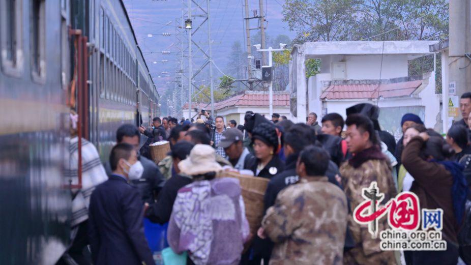 2024年11月20日,彝歷新年第一天,成昆線5633次慢火車??吭谡九_,彝族同胞有序乘車。原波 攝