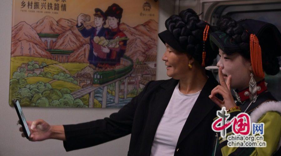 沿途,每當列車??吭谲囌镜却臅r間,彝族老鄉(xiāng)在鐵路工作人員的協(xié)同配合下搬起水果,牽起牛羊,抱起雞鴨放進一節(jié)節(jié)行李車廂上,慢火車的貨架上擺滿了農(nóng)產(chǎn)品。車廂里,人們互相交談,圍坐在一起放聲歌唱,好不熱鬧,歡樂的聲音從車廂內(nèi)傳出,像是在向廣袤的山川大地宣告著彝歷新年的盛事。