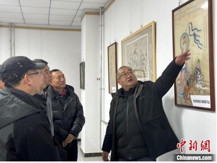 12月17日,由蘭州市七里河區(qū)委宣傳部、七里河區(qū)文體旅局聯(lián)合舉辦的“大漠孤陽(yáng)映彩霞 敦煌神韻美如畫(huà)”新時(shí)代文明實(shí)踐主題活動(dòng)暨敦煌巖彩畫(huà)書(shū)畫(huà)藝術(shù)展拉開(kāi)帷幕。圖為展覽組織者為參觀者講解展出的作品。楊娜 攝