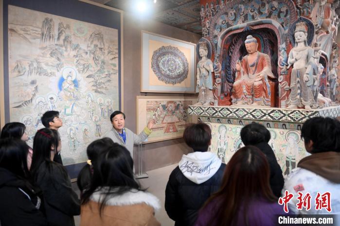1月14日,甘肅省酒泉市,甘肅酒泉職業(yè)技術(shù)學(xué)院非物質(zhì)文化遺產(chǎn)敦煌彩塑技藝傳習(xí)所內(nèi),學(xué)生們參觀敦煌壁畫作品。中新社記者 李亞龍 攝