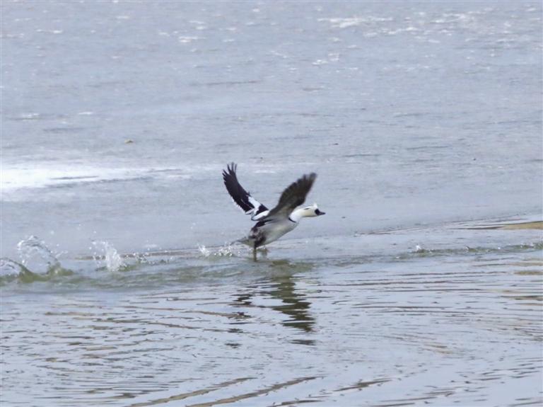 斑頭秋沙鴨是我國(guó)“三有”保護(hù)動(dòng)物,它還有一個(gè)萌萌的名字,叫“熊貓鴨”。瞧,它那黑白相間的羽毛,眼睛周?chē)托茇堃粯樱翊髁艘桓蹦R,時(shí)而潛入水下追捕魚(yú)兒,時(shí)而與同伴嬉戲,時(shí)而振翅飛翔,可愛(ài)活潑的模樣在水面上格外顯眼。