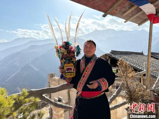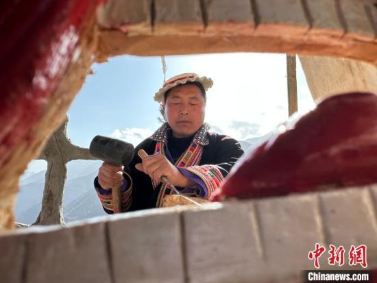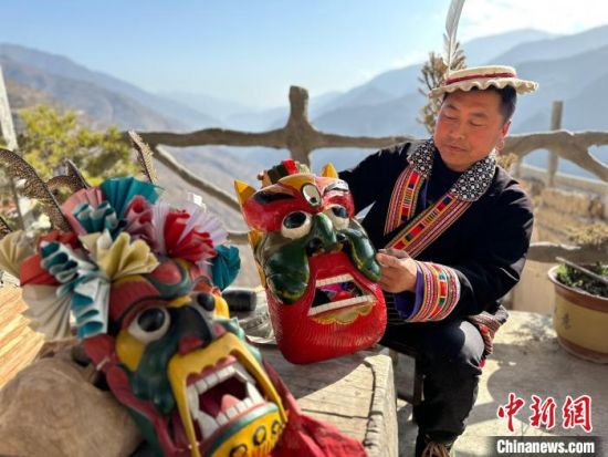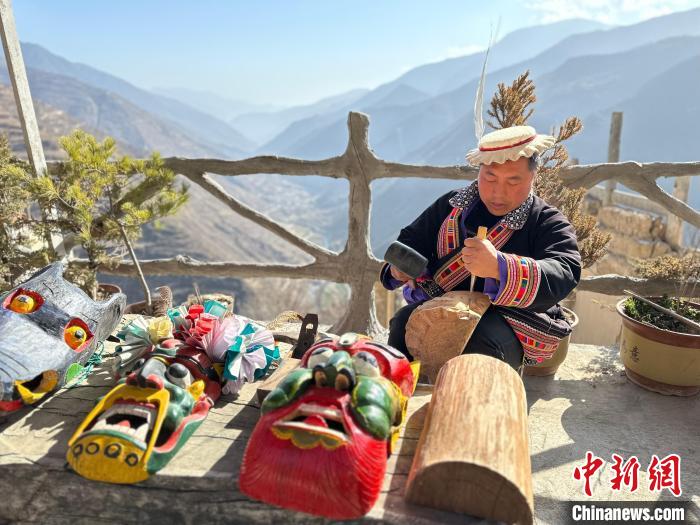 雕刻、打磨、上色……甘肅隴南市文縣鐵樓藏族鄉(xiāng)強(qiáng)曲村,白馬人薛剛一家四代人都精于木工。日前中新網(wǎng)記者走訪村子時(shí),薛剛坐在自家院子里,伏案制作池哥晝所用面具。池哥晝是白馬人保留最完整、最具特色民族舞蹈,面具是重要道具之一。薛剛制作的面具不僅用于周邊村子的池哥晝中,而且被廣州、上海等地的客商購(gòu)買收藏。他時(shí)常將自己的想象融入面具中,用心打磨使其更具“靈氣”。他說,白馬人中從事面具雕刻的手藝人不多,最近他物色了一個(gè)“00后”徒弟,對(duì)方興趣濃厚,希望將這門手藝保護(hù)傳承好。圖為薛剛在院子里雕刻面具。閆姣 攝