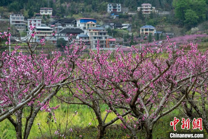 3月15日,在廣西田林縣浪平鎮(zhèn)浪平村,滿樹桃花與錯落村舍相互映襯。黃數(shù)情 攝