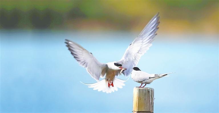 敏捷的普通燕鷗在洲灘養(yǎng)足了精神,當它的雪白翼尖剪開霧幕時,巢卵正藏在浮筏水草的根部。雛鳥破殼時頭頂戴著略染橘紅的胎帽,像是自然為新生者加冕。不論是饑腸轆轆還是飽食小魚,它的叫聲總是尖銳清脆,猶如冰裂,與尕海湖的水聲交織成夏日搖籃曲。