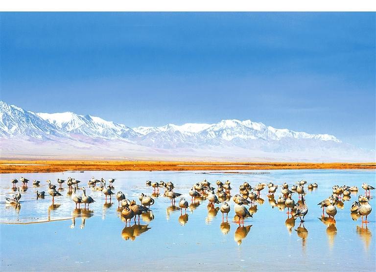 當祁連山的雪線以肉眼難以察覺的速度后退時,鹽池灣的冰封鏡面開始出現(xiàn)裂紋。最先感知到這一變化的不是融水沖刷出的溝壑,而是斑頭雁黃色的喙。它們在三月底的晨昏線上劃過,雙翅呼呼生風。冰凌碎屑尚未與雁羽摩擦,便已發(fā)出細密的簌響,像是古琴開弦前的調(diào)音。野馬南山與黨河南山兩山之間形成的盆地內(nèi)河流縱橫、湖泊密布,草甸、沼澤交錯,是斑頭雁和其他水鳥世代棲息繁衍的場所。盡管先頭部隊在3月下旬就已抵達這里,主力部隊卻要到4月上旬才會姍姍來遲。此時斑頭雁幼體已在越冬地充分發(fā)育,羽衣上幾乎看不到如苔蘚般斑駁生長的新羽,只是頭部的兩條黑帶不如父母深邃,這是它們少經(jīng)風霜的證明。它們降落在濕地灘涂時,雝雝鳴雁,那聲音或許與兩千年前蘇武牧羊時在北海之畔聽到的有些許相似。