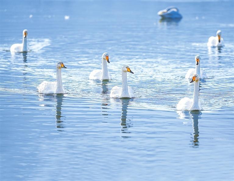 蘭州三江口濕地的冰封河畔上,大天鵝用喙基布滿冰霜的橙喙鑿開生存通道。這里是目前野生天鵝在蘭州的唯一越冬所,為冬日黃河增添了一份靈動和生機。這些北方來客的羽毛并非純白,頸部沾染鹽霜草漬后形成獨特的顏色與紋路,像是歲月在它們身上留下的印記。當?shù)亟M織了巡護,并有專人定期投飼。