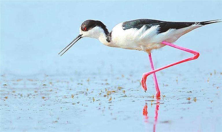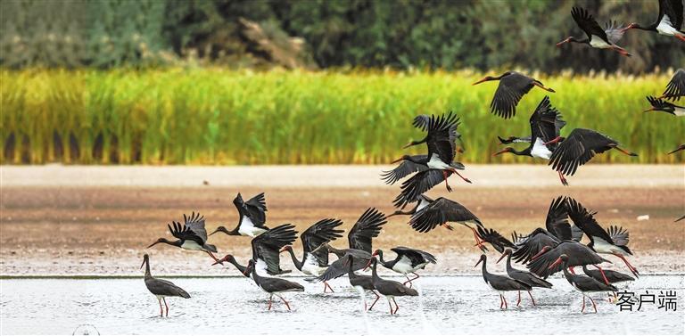 九月的黑河濕地,蘆葦蕩在秋陽下鍍成金箔,黑鸛群如流動的墨玉鑲嵌其中。這種因其配色和珍稀程度被稱為“鳥中熊貓”的珍禽,是出色的捕魚能手。隨著它精準鎖定水下獵物,赤紅色長喙掠過水面,黑、白、紅的絕色搭配如同流動的墨畫。中國最大的黑鸛種群——600余只在此集結(jié),夜棲時其倒影連成一線,讓觀鳥者想起傳世的水墨長卷。