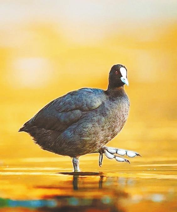 白骨頂又被喚作骨頂雞,卻是鶴類的遠親。它靜浮水面時,額前一抹象牙白,宛若遺落人間的墨玉鎮(zhèn)紙。這枚額甲實為特化的角質(zhì)層,是為了保護頭部的盔胄?;野咨陌牾肴缪┑匮グ惆洪g,劃開水藻時泛起粼粼波光——這身黑羽配雪蹼的穿搭,竟比時裝周的極簡主義更先鋒。當它們列隊掠過蘆葦蕩,水淼勾勒的剪影里,仿佛在繪制著秋天的信箋。