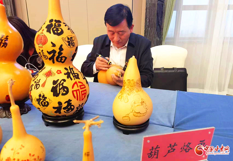 葫蘆諧音“福祿”,寓意平安吉祥、健康長壽。經(jīng)過多年的堅(jiān)持和努力,賈永飛創(chuàng)作了一批成熟的烙畫葫蘆作品,2015年賈永飛被評(píng)為張掖市非物質(zhì)文化遺產(chǎn)代表性傳承人。