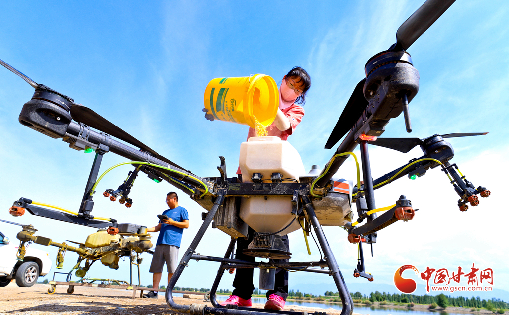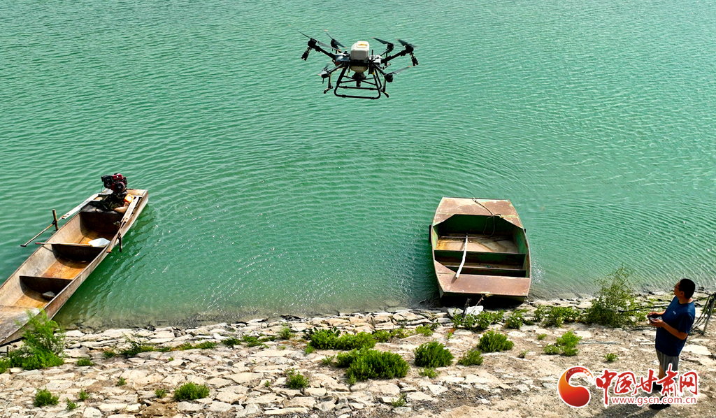 6月24日,在高臺(tái)縣夾溝湖水庫(kù)螃蟹養(yǎng)殖基地,無人機(jī)操作手啟動(dòng)設(shè)備,載滿飼料的無人機(jī)沿預(yù)設(shè)航線在800多畝螃蟹養(yǎng)殖基地上空精準(zhǔn)投喂。