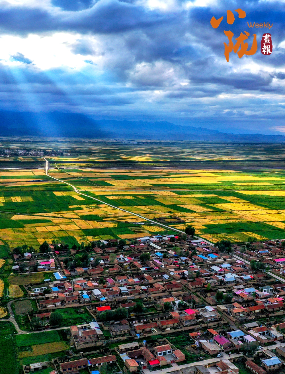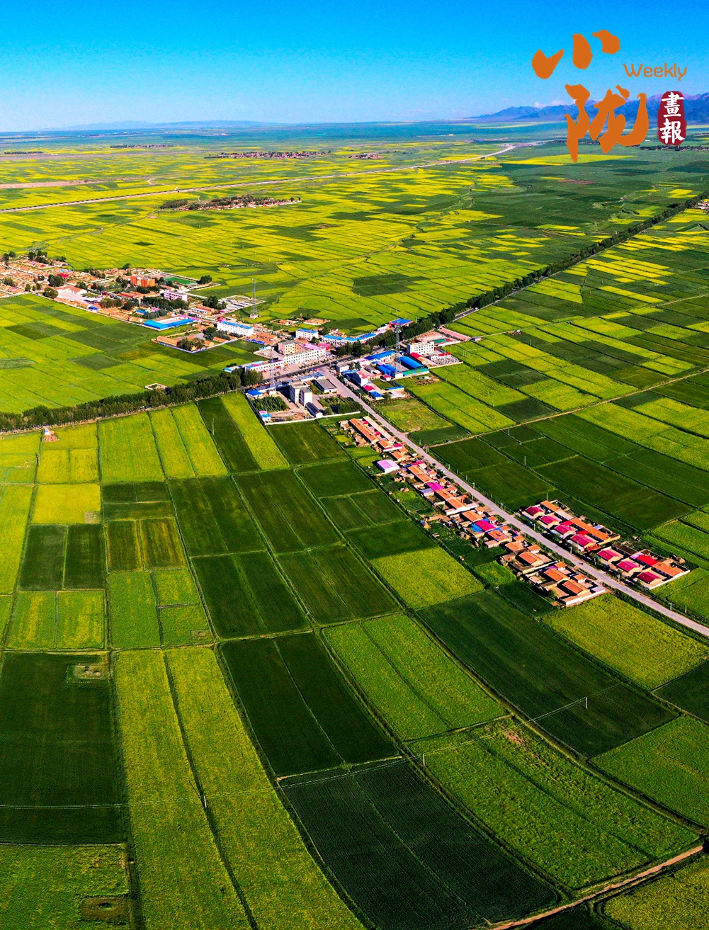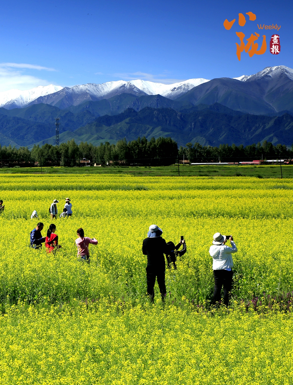 廣袤無邊的田野生機(jī)盎然,金黃色的油菜花夾雜著一塊塊碧綠色的麥田,好像給大地鋪上了一層五顏六色的大地毯。漂亮的民居鑲嵌其中,與祁連山相互輝映,在陽光下美麗極了!