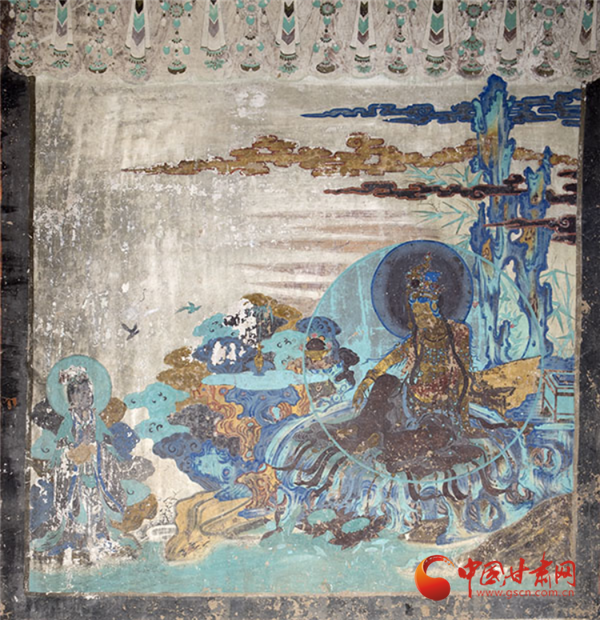 兩幅作品均以青綠色調(diào)為主,觀音面部貼金雖已氧化,卻仍顯清新淡雅,更以“馬一角、夏半邊”的構(gòu)圖巧思,用對角線分割畫面、大量留白,讓有限的壁面生出無窮空間感,堪稱中國傳統(tǒng)美學(xué)與佛教哲理的完美融合——正如唐代白居易贊水月觀音“凈淥水上,虛白光中”,這般意境在榆林窟的壁畫里被演繹得淋漓盡致。