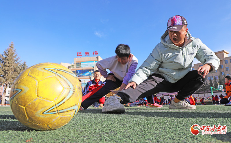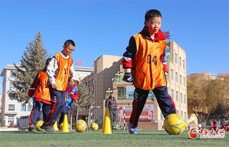 11月11日,在張掖市民樂縣洪水小學(xué)的足球場上,學(xué)生們在進(jìn)行足球訓(xùn)練。