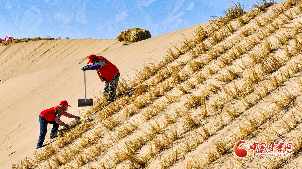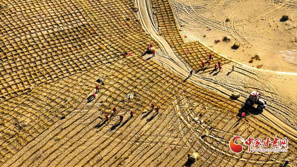 連日來,在張掖市肅南裕固族自治縣明花鄉(xiāng)西南部的干旱荒漠區(qū),運(yùn)草車輛往復(fù)穿梭,1600余名治沙工人于巴丹吉林沙漠西南緣的沙丘間忙碌作業(yè)。他們劃線、背草、俯身鋪草、揮鍬壓埋,全力營(yíng)建沙障與固沙林帶,為沙漠牢牢“鎖邊”。