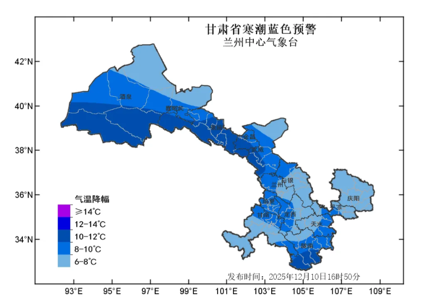 蘭州中心氣象臺2025年12月10日16時50分發(fā)布寒潮藍(lán)色預(yù)警:預(yù)計11日至13日清晨,全省大部自西向東最低氣溫下降6-8℃,其中河西五市、隴南等部分地方及隴中局部地方下降8~10℃,局地可達(dá)10℃以上,上述部分地方將出現(xiàn)寒潮。河西五市降溫時段為11日白天至12日白天,省內(nèi)其余地方降溫時段為11日夜間至13日清晨。請注意防范!