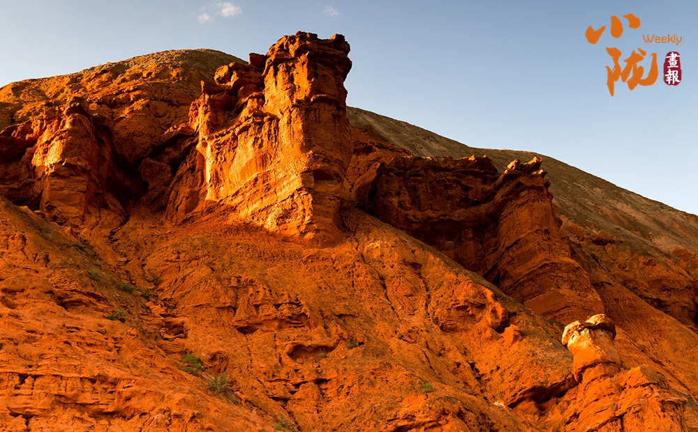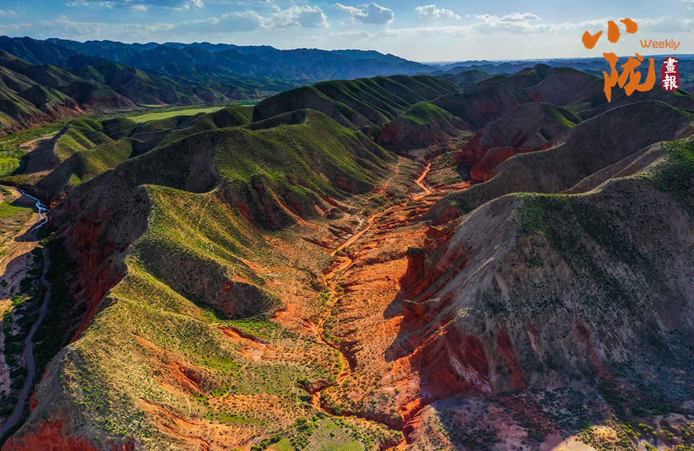 極目遠眺,丹霞丘陵在廣袤的黃土高原上奔騰不息,猶如一座座火焰山。朱砂紅如烈焰燃燒,赭石黃似大地厚土,青黛綠若幽谷深潭,間或夾雜著沉穩(wěn)的灰褐,共同編織出一種難以言喻的斑斕與和諧。