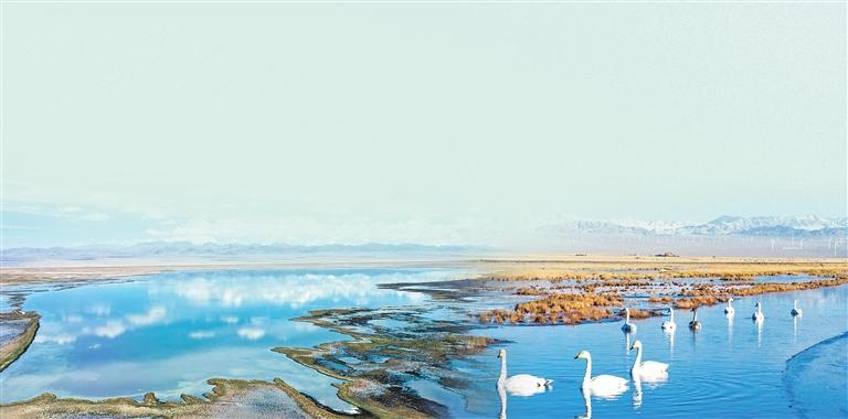 在嘉峪關市新城草湖國家濕地公園,美麗的冬景、自由游弋的天鵝,構成一幅旖旎的生態(tài)畫卷。