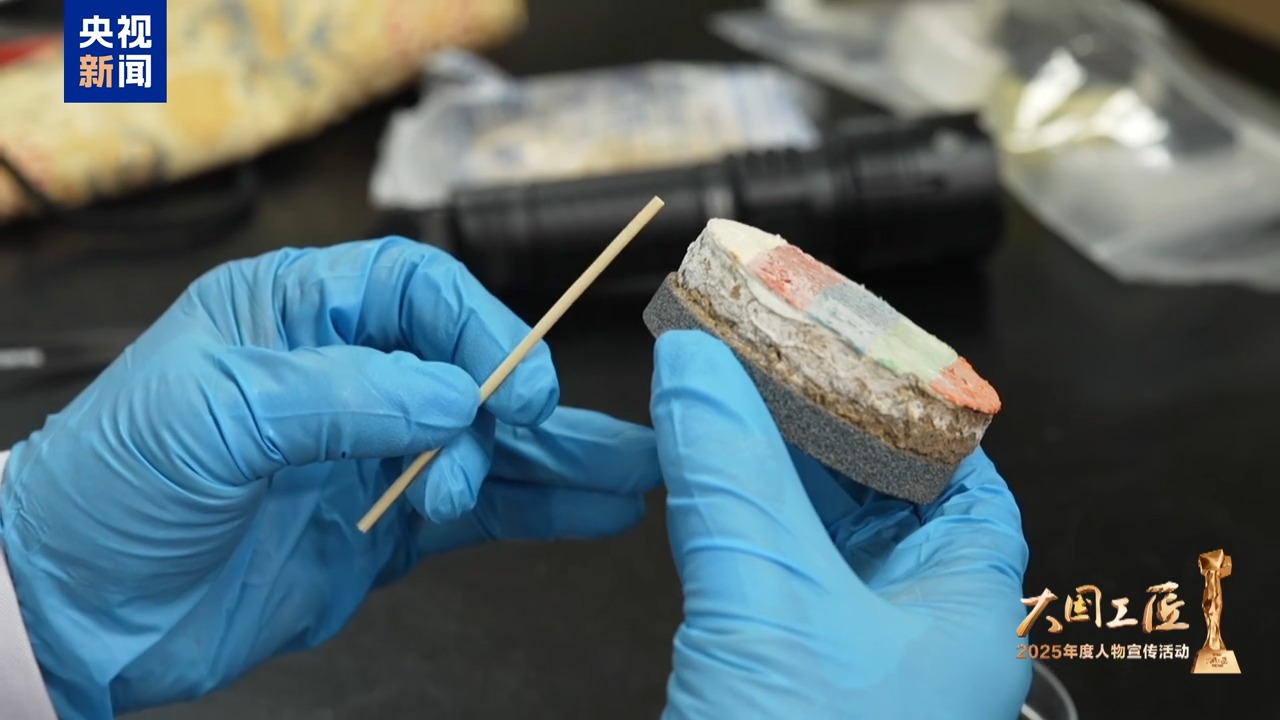 敦煌研究院 樊再軒:那段時間就看什么都像脫鹽材料,想起來就試,后來有時候會想:面粉也行吧?面粉不行,面粉有黏結(jié)力。突然想到那個白口布、棉布、線手套也可以用……想起來我們就試、想起來我們就試。