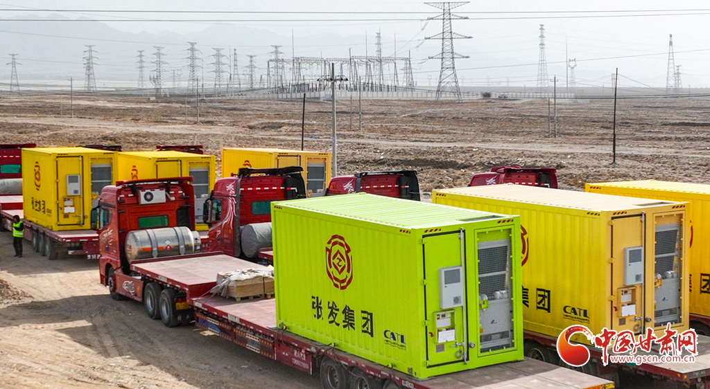 3月19日,張掖市山丹縣東樂灘上,大型運(yùn)輸車輛正在拉運(yùn)一臺(tái)臺(tái)“超級(jí)充電寶”。