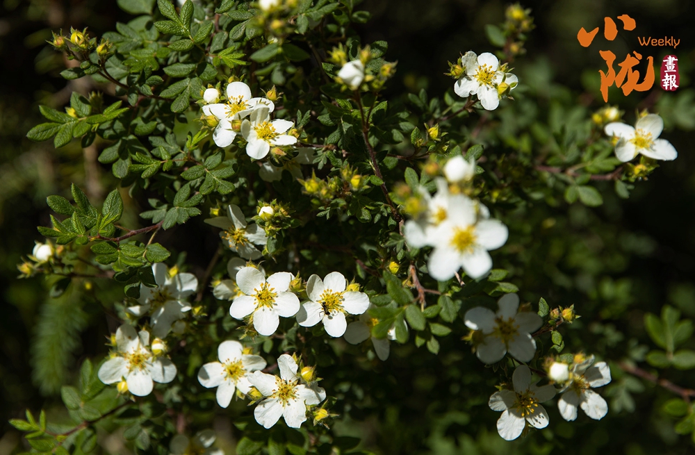 銀露梅,屬于薔薇科委陵菜屬落葉灌木。它多生長在高海拔的山坡、巖石縫中,葉片羽狀分裂,邊緣帶鋸齒,白色小花簇?fù)黹_放,花蕊明黃,花期在5-7月,耐寒耐旱,是頗具觀賞價值的野生植物。